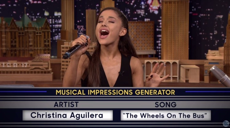 E Ariana simplesmente arrasou em sua imitação de Britney Spears, Christina Aguilera e Celine Dion. Jimmy Fallon, que também fez suas imitações, ficou completamente sem graça ao ver a desenvoltura da garota.