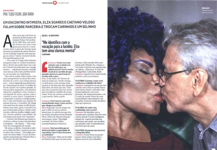 Caetano também falou de como se conheceram: “Não foi pessoalmente, ouvi uma gravação. Me impressionaram a voz e o jeito de cantar.” e ainda completou, “Elza é de uma musicalidade extraordinária, top mundial, acima da média brasileira logo que apareceu.”. A afinidade entre os dois também foi alvo de resposta para Caetano veloso: “Me identifico com a vocação para a lucidez. Elza tem uma grande clareza mental. É muito inteligente e sempre foi.”.