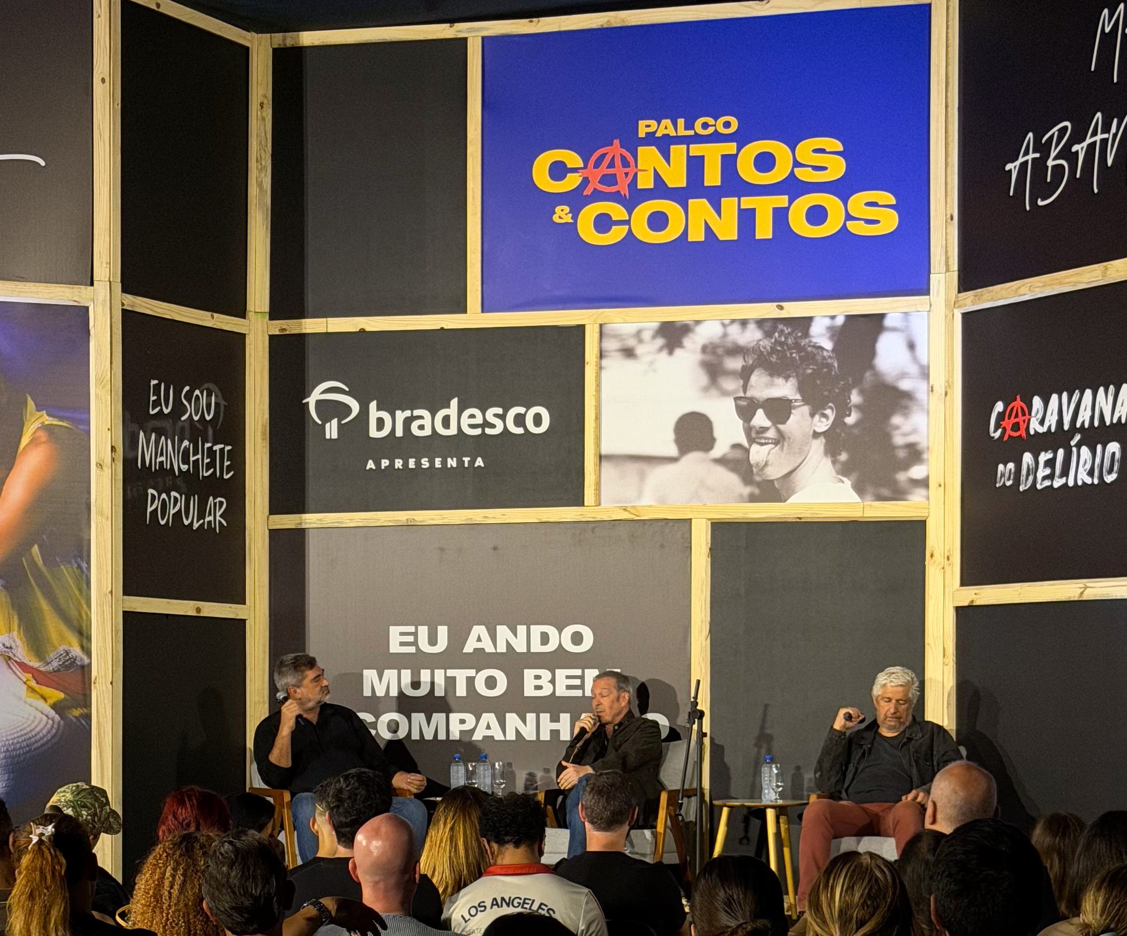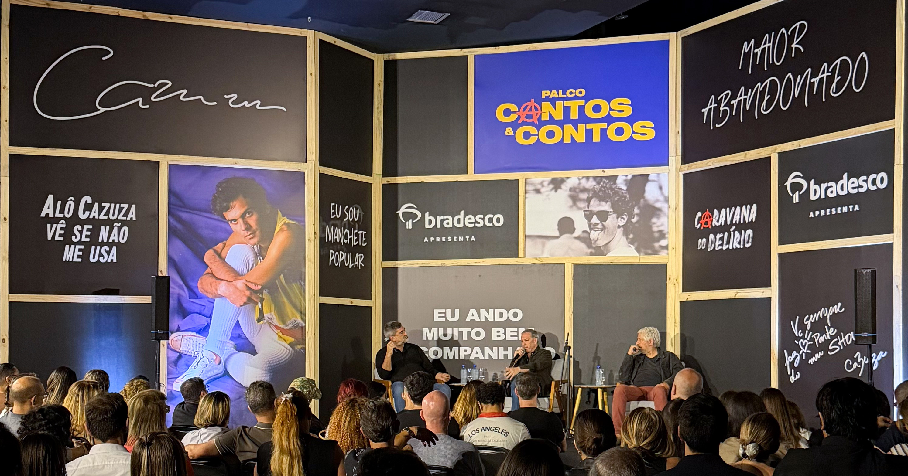 O Palco Cantos e Contos, dedicado à música, poesia e conversas ao vivo, é parte integrante da exposição em São Paulo. Antes de receber Pedro Bial, o espaço já promoveu encontros conduzidos por Zeca Camargo, que reuniu parceiros centrais da obra de Cazuza, como Dé Palmeira, Leoni e Nilo Romero, além do fotógrafo Frederico Mendes, responsável por registros emblemáticos do artista. Zeca Camargo foi o primeiro convidado do Palco Cantos e Contos e o jornalista a quem Cazuza revelou publicamente, pela primeira vez, ser portador do vírus da Aids.