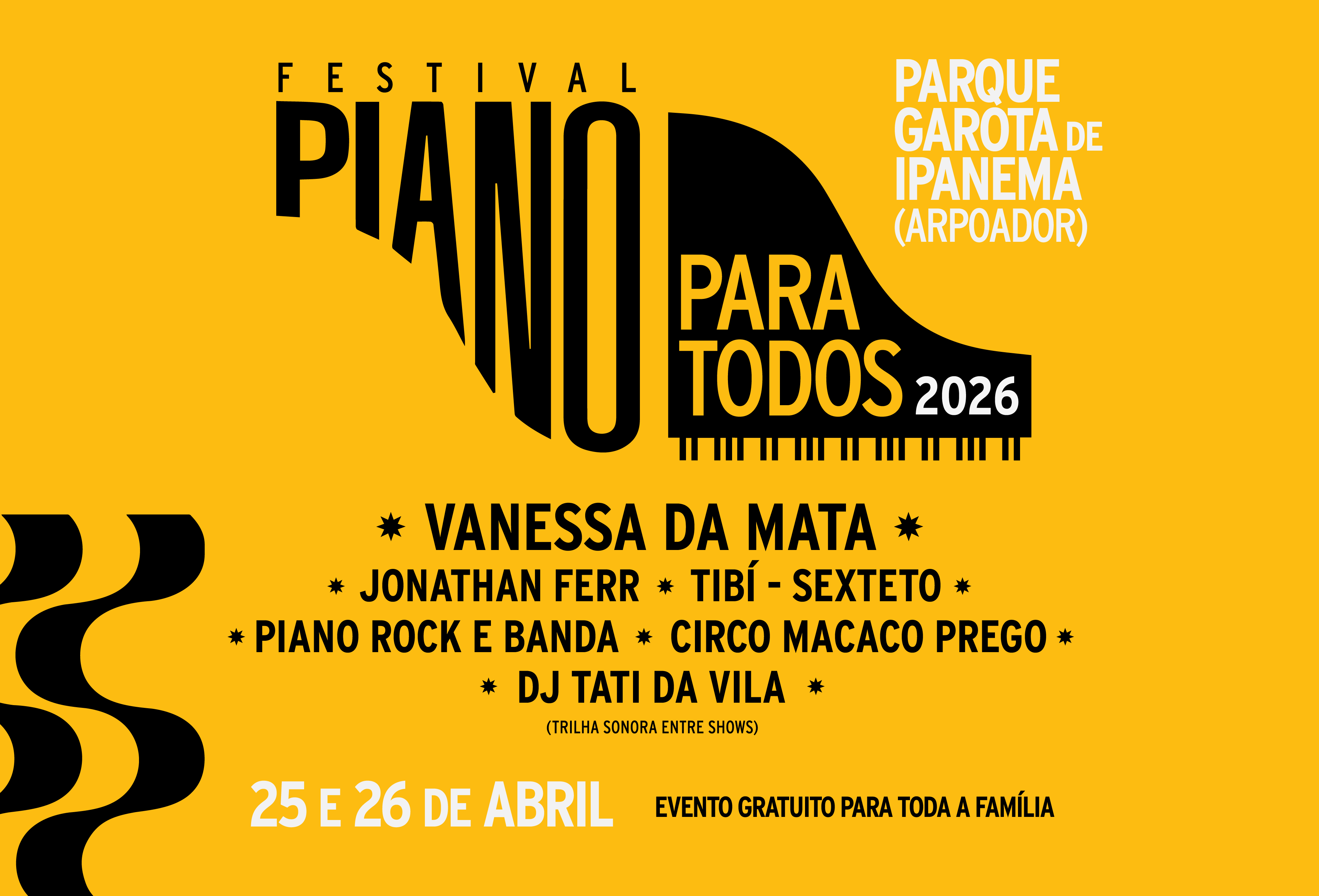 O Festival Piano para Todos chega à sua terceira edição nos dias 25 e 26 de abril de 2026, ocupando novamente o palco sustentável instalado no Parque Garota de Ipanema. Com uma programação musical gratuita, que tem o piano como um dos elementos centrais, e reafirmando sua vocação para grandes encontros musicais ao ar livre, o festival conecta públicos diversos em um formato acessível e integrado à cidade.