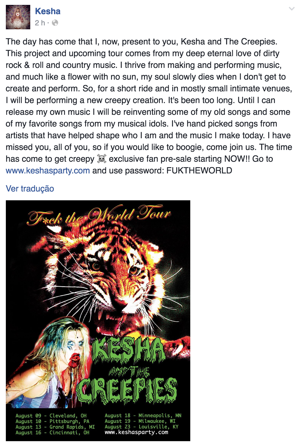 “Chegou o dia em que eu, agora, apresento a vocês, Kesha e The Creepies. Esse projeto e turnê que vem por aí vêm do meu profundo eterno amor pelo rock & roll pesado e a música country. Eu cresci por fazer e apresentar música e muito como uma flor sem sol, minha alma morre lentamente quando eu não crio e me apresento. Então, por um tempo e em sua maioria em lugares menores e mais íntimos, eu vou apresentar uma nova e assustadora criação. Levou muito tempo. Até que eu possa lançar minha própria música eu vou reinventar alguns dos meus antigos sons e algumas das músicas favoritas dos meus ídolos musicais. Eu mesma escolhi músicas de artistas que ajudaram a formar quem eu sou e a música que faço hoje. Eu perdi vocês, todos vocês, então se você gostaria de dançar, junte-se a nós. Chegou o momento de se tornar assustador. Venda exclusiva para fãs começa agora! Vá em www.keshasparty.com e use a senha: FUKTHEWORLD”