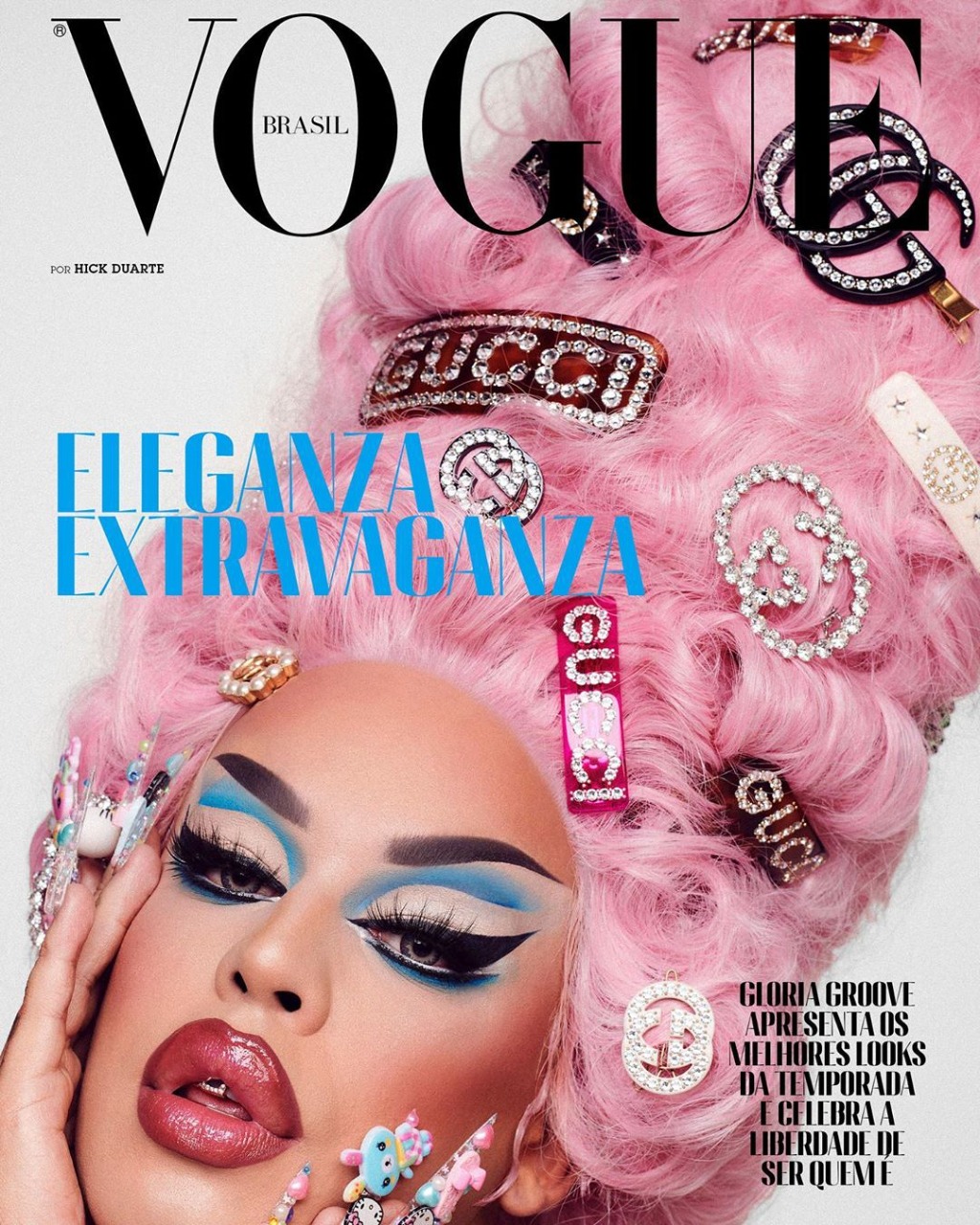 Poucas horas depois, a revista anunciou Gloria Groove como a segunda cover girl: “Foram mais de 45 perucas, 40 pares de luvas, 5 araras lotadas de roupas, 20 presilhas, 44 cílios e incontáveis unhas postiças extralongas no set para orquestrar as capas da #VogueOutubro, que têm como segunda cover queen, a multiartista @gloriagroove. “Vim no carro pesquisando as fotos mais icônicas da revista e absorvendo o fato de que agora chegou a minha vez. Estou vivendo um sonho e sigo emocionada com o convite porque posiciona drag queens como ícones de moda”, contou ela, entre um retoque e outro na maquiagem autoral. “Fico muito feliz que a gente esteja ocupando espaços como esse, me sinto em casa. Acho que nasci para isso”.