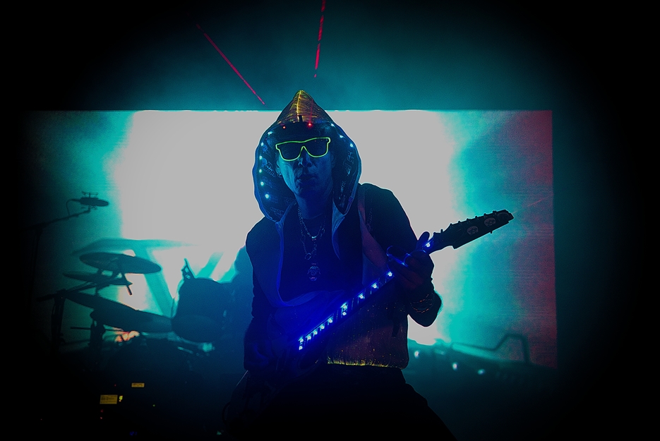 Após uma referência ao filme ‘Crossroads‘ no telão, o homem da noite subiu no palco vestido com um capuz de prata, com lasers vermelhos piscando e óculos de neon. Parecia realmente ser um personagem oriundo de uma outra galáxia. Mas foi com sua música que Steve Vai mostrou mais uma vez que ele pode ser considerado uma criatura fora de série. Além do dom sobrenatural de tocar guitarra, Vai sabe como deixar uma apresentação atrativa, evitando que ela perca força ou se torne virtuosamente cansativa. O mais legal dessa apresentação, é que ela não se resume a um simples show de virtuose – como acontece com outros grandes nomes da guitarra. Ela esconde muitas surpresas e momentos de interatividade pontuais – principalmente na utilização dos telões. Houve até mesmo um pedido de casamento em cima do palco, logo na terceira canção.