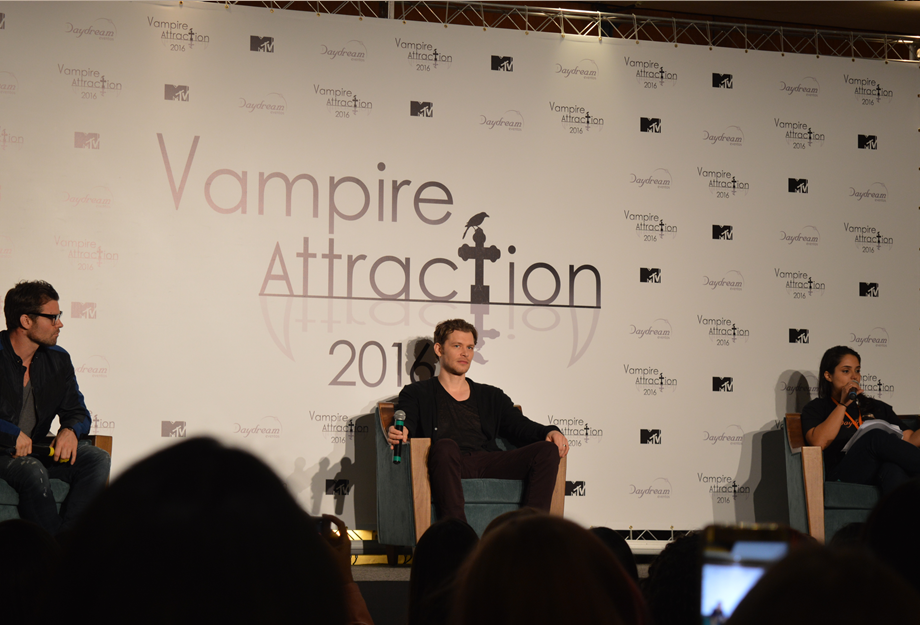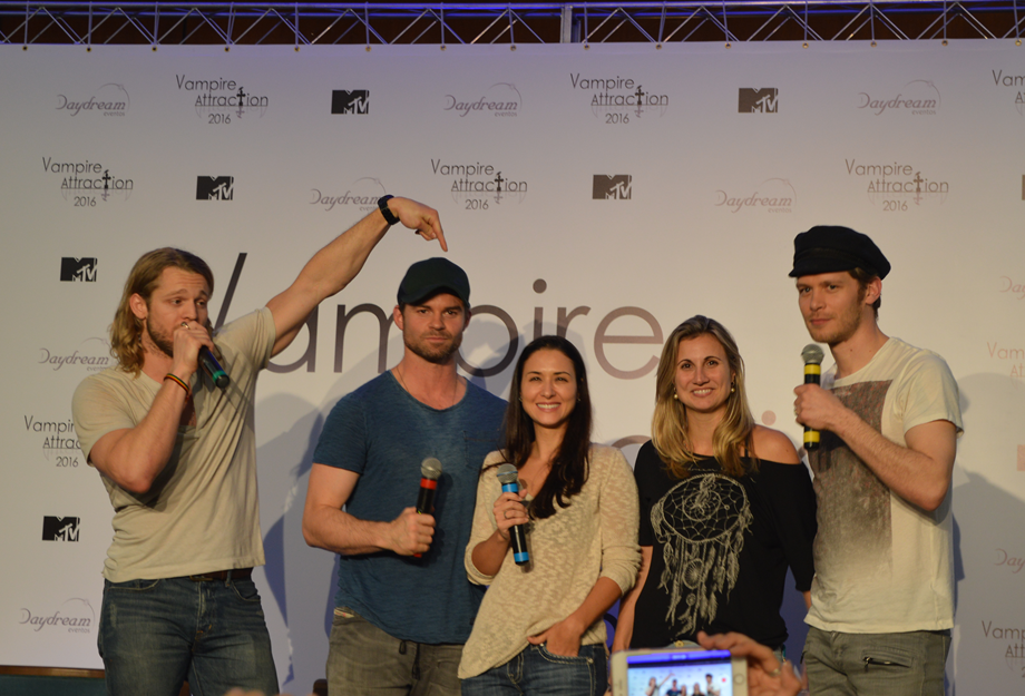No sábado, o dia começou como um sonho para as fãs da série “The Originals”, que é exibida no Brasil pela MTV. Milhares de fãs tiveram a oportunidade de conhecer seus ídolos em uma convenção que permite esse contato de pertinho com os grandes atores das séries americanas. Perto das 9h15 da manhã começou o primeiro painel da “Vampire Attraction”, que contou com a participação de Daniel Gillies (Elijah) e Chase Coleman (Oliver). Durante o painel os atores responderam diversas perguntas de fãs e Chase até tirou a camisa para a alegria das fãs presentes. Algumas das perguntas foram referentes ao cancelamento do Ian Somerhalder, que estava confirmado para a convenção e cancelou bem próximo ao evento. Daniel até comentou que Joseph estar aqui é 10 vezes melhor do que a vinda do Ian.