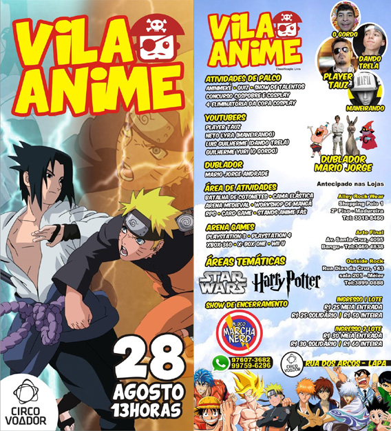Você curte anime, games e quadrinhos? Então você foi feito para o Vila Anime! Fãs e admiradores de personagens, desenhos de qualquer tipo, HQs, seriados, games e filmes se reúnem no evento que, este ano, aconteceu no Circo Voador no domingo 28 de agosto. Atualmente, os eventos de anime são multi-temáticos, abrem espaço para diversos assuntos, não somente desenhos e quadrinhos japoneses.